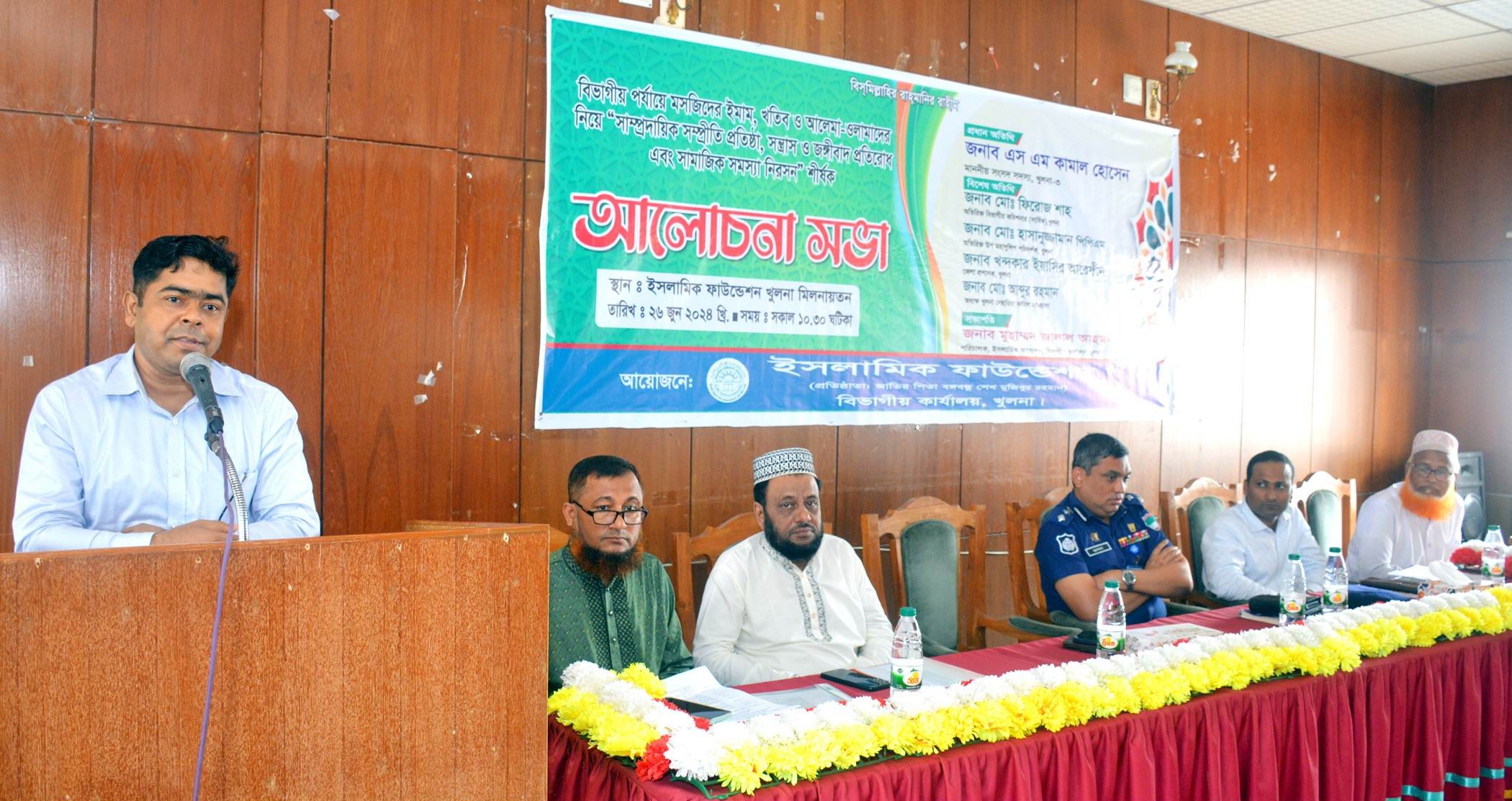 বিভাগীয় পর্যায়ে মসজিদের ইমাম, খতিব ও আলেমা-ওলামাদের নিয়ে ‘সাম্প্রদায়িক সম্প্রীতি প্রতিষ্ঠা, সন্ত্রাস ও জঙ্গিবাদ প্রতিরোধ এবং সামাজিক নিরসন’ শীর্ষক আলোচনা সভা বুধবার দুপুরে খুলনা বিভাগীয় ইসলামিক ফাউন্ডেশনের সম্মেলনকক্ষে অনুষ্ঠিত হয়। এতে প্রধান অতিথি ছিলেন খুলনার অতিরিক্ত বিভাগীয় কমিশনার (সার্বিক) মোঃ ফিরোজ শাহ। প্রধান অতিথি তাঁর বক্তৃতায় বলেন, ইমাম, খতিব ও আলেম-ওলামাগণ হলো ধর্মীয় ও সামাজিক নেতা। সমাজে তাদের কথা সকলে মন দিয়ে শোনেন। ইসলাম ধর্মকে ইতিবাচকভাবে সমাজের মানুষের কাছে প্রচার ও বিষয়ভিত্তিক আলোচনা করতে হবে। আলেম-ওলামারা সমাজের একটি গুরুত্বপূর্ণ জায়গায় আছেন, এটা আপনাদের অনুধাবন করতে হবে। সন্ত্রাস ও জঙ্গিবাদ প্রতিরোধে সবাইকে সচেতন করে তুলতে হবে। তিনি আরও বলেন, ইসলামের সঠিক আদর্শ ও শিক্ষার প্রচার-প্রসারের জন্য জাতির পিতা বঙ্গবন্ধু শেখ মুজিবুর রহমান ইসলামিক ফাউন্ডেশন প্রতিষ্ঠান করেন। অনুষ্ঠানে বিশেষ অতিথির বক্তৃতা করেন খুলনা রেঞ্জ এর অতিরিক্ত ডিআইজি মোঃ হাসানুজ্জামান, অতিরিক্ত জেলা ম্যাজিস্ট্রেট মীর আলিফ রেজা ও খুলনা নেছারিয়া কামিল মাদ্রাসার অধ্যক্ষ মোঃ আব্দুর রহমান। খুলনা বিভাগীয় ইসলামিক ফাউন্ডেশনের পরিচালক মুহাম্মদ জালাল আহমদের সভাপতিত্বে অনুষ্ঠানে স্বাগত বক্তৃতা করেন সহকারী পরিচালক মুহাম্মদ আশরাফ আলী। খুলনা বিভাগীয় ইসলামিক ফাউন্ডেশন এই অনুষ্ঠানের আয়োজন করে।-তথ্য বিবরণী