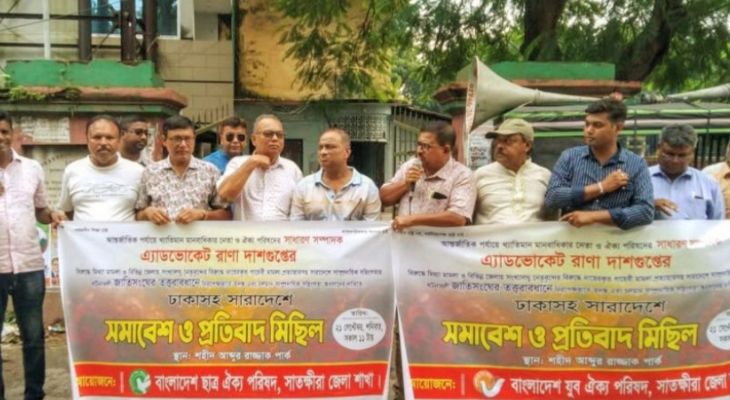 হিন্দু বৌদ্ধ খ্রিস্টান ঐক্য পরিষদের কেন্দ্রীয় সাধারণ সম্পাদক অ্যাডভোকেট রানা দাশ গুপ্তসহ দেশের বিভিন্ন স্থানে হিন্দু ধর্মাবলম্বীদের বিরুদ্ধে দায়েরকৃত গায়েবী মামলা প্রত্যাহার ও সাম্প্রদায়িক সহিংসতার ঘটনাবলী জাতিসংঘের তত্ত্বাবধানে নিরপেক্ষভাবে তদন্ত ও অবসানের দাবিতে সাতক্ষীরায় প্রতিবাদ সমাবেশ ও বিক্ষোভ মিছিল অনুষ্ঠিত হয়েছে। শনিবার (২১ সেপ্টেম্বর) দুপুরে সাতক্ষীরা প্রেসক্লাবের সামনে বাংলাদেশ ছাত্র ঐক্য পরিষদ জেলা শাখার আয়োজনে এই বিক্ষোভ মিছিল ও প্রতিবাদ সমাবেশ অনুষ্ঠিত হয়। সমাবেশ শেষে একটি বিক্ষোভ মিছিল শহরের প্রধান প্রধান সড়ক প্রদক্ষিণ করে শহীদ আব্দুর রাজ্জাক পার্কে গিয়ে শেষ হয়।