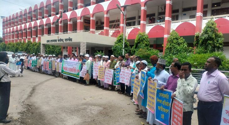 বৈষম্য দূরীকরণে বেসরকারি মাদ্রাসা ও মাধ্যমিক শিক্ষা প্রতিষ্ঠান জাতীয়করণ, জাতীয়করণের পূর্ব পর্যন্ত শিক্ষা প্রশাসনের বিভিন্ন পদে সরকারি স্কুলের শিক্ষকদের পদায়ন বন্ধ রাখা ও শিক্ষা সংস্কার কমিশন গঠনের দাবীতে সাতক্ষীরায় মানববন্ধন ও স্মারকলিপি পেশ করেছে শিক্ষকরা।