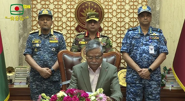অথচ, গত ৫ আগস্টে জাতির উদ্দেশে ভাষণে রাষ্ট্রপতি মো. সাহাবুদ্দিন বলেন, ‘আপনারা জানেন, প্রধানমন্ত্রী শেখ হাসিনা আজ রাষ্ট্রপতির কাছে পদত্যাগ জমা দিয়েছেন এবং আমি তা গ্রহণ করেছি। প্রধানমন্ত্রীর পদত্যাগ ও বৈষম্যবিরোধী ছাত্র আন্দোলনে সৃষ্ট পরিস্থিতিতে আজ বঙ্গভবনে তিন বাহিনীর প্রধান এবং বিভিন্ন রাজনৈতিক দলের নেতৃবৃন্দ সুশীল সমাজের প্রতিনিধি ও বৈষম্যবিরোধী ছাত্র আন্দোলনের কয়েকজন সমন্বয়কের সাথে আলোচনা হয়। শুরুতেই সেনাপ্রধান বিরাজমান সার্বিক পরিস্থিতি ও রাজনৈতিক দলগুলোর সঙ্গে তার আলোচনা সম্পর্কে আমাকে অবিহিত করেন। রাজনৈতিক নেতৃবৃন্দও এ সময় তাদের বক্তব্য তুলে ধরেন। সভায় বৈষম্যবিরোধী ছাত্র আন্দোলনে নিহত শহীদদের স্মরণে শোক প্রস্তাব গৃহীত হয়। এ ছাড়া জরুরি ভিত্তিতে একটি অন্তর্বর্তী সরকার গঠনের সিদ্ধান্ত নেওয়া হয়।’