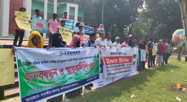 বেসরকারী উন্নয়ন সংগঠন লিডার্সের সহযোগিতায় সাতক্ষীরা জেলা জলবায়ু অধিপরামর্শ ফোরাম বৃহস্পতিবার (১৪ নভেম্বর) শহরের শহীদ আব্দুর রাজ্জাক পার্কে এই মানববন্ধনের আয়োজন করে। মানববন্ধনে বিভিন্ন স্তরের মানুষ, স্থানীয় জনগণ, জনপ্রতিনিধি সমাজকর্মী ও পরিবেশবাদী সংগঠনের প্রতিনিধিরা অংশগ্রহণ করেন।