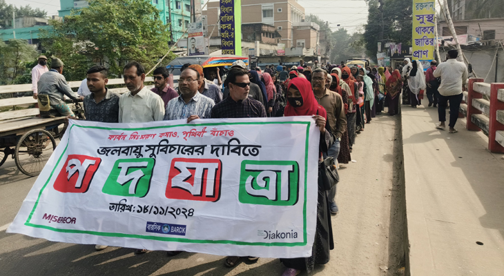 সাতক্ষীরায় জলবায়ু সুবিচারের দাবিতে পদযাত্রা অনুষ্ঠিত হয়েছে। সোমবার (১৮ নভেম্বর) সকালে পদযাত্রাটি সাতক্ষীরা কেন্দ্রীয় শহীদ মিনার থেকে বের হয়ে শহরের প্রধান প্রধান সড়ক প্রদক্ষিণ করে নিউমার্কেট মোড়ে গিয়ে শেষ হয়। বাংলাদেশ রিসোর্স সেন্টার ফর ইনডিজেনাস নলেজ (বারসিক) এবং শিক্ষা, সংস্কৃতি ও বৈচিত্র্য রক্ষা টিম আয়োজিত এই পদযাত্রা শেষে এক সংক্ষিপ্ত সমাবেশে বক্তারা বলেন, বিশ্বের উন্নত দেশগুলো অতীতে কার্বন নিঃসরণ কমিয়ে ক্ষতিপূরণ দেওয়ার নানা প্রতিশ্রুতি দিলেও তারা তাদের প্রতিশ্রুতি রক্ষা করেনি। বৈশ্বিক উষ্ণতা প্রতিরোধে তাদের কার্বন নিঃসরণ কমাতে হবে। একই সাথে ক্ষতিগ্রস্ত দেশগুলোকে ক্ষতিপূরণ দিতে হবে।