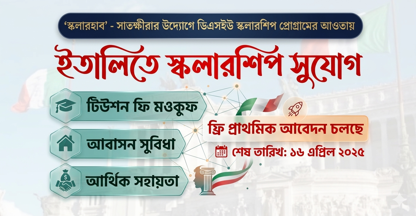 সাতক্ষীরা ভিত্তিক প্রতিষ্ঠান স্কলারহাব-এর উদ্যোগে ইতালির পাবলিক বিশ্ববিদ্যালয়ে DSU Scholarship Programme-এর আওতায় উচ্চশিক্ষার সুযোগ প্রদান করা হচ্ছে।