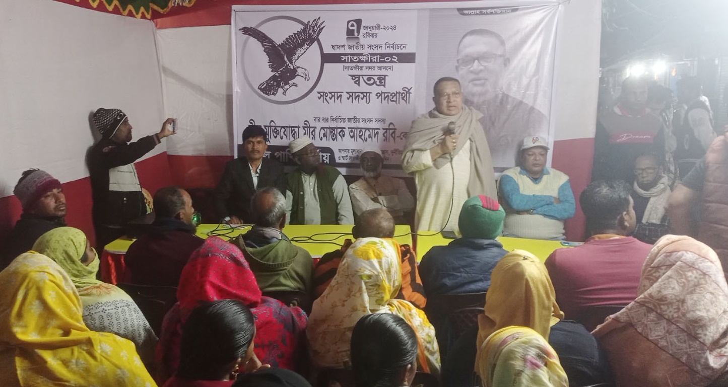 দ্বাদশ জাতীয় সংসদ নির্বাচনে সাতক্ষীরা-২ আসনের স্বতন্ত্র পদপ্রার্থী বীর মুক্তিযোদ্ধা মীর মোস্তাক আহমেদ রবির ঈগল প্রতীকের নির্বাচনী পথসভা অনুষ্ঠিত হয়েছে। বুধবার (২০ ডিসেম্বর) সন্ধ্যা সাড়ে ৬টায় পৌরসভার ৫নং ওয়ার্ডের চালতেতলা বাজারে ওয়ার্ড আওয়ামী লীগের সহ-সভাপতি মাস্টার মনির উদ্দিনের সভাপতিত্বে নির্বাচনী পথসভায় প্রধান অতিথির বক্তব্য রাখেন স্বতন্ত্র পদপ্রার্থী বীর মুক্তিযোদ্ধা এমপি রবি। প্রধান অতিথির বক্তব্যে এমপি রবি বলেন, “আমাদের দক্ষিণ বঙ্গে পদ্মাসেতুসহ ব্যাপক উন্নয়ন করেছেন। সেজন্য জননেত্রী শেখ হাসিনাকে ভুলে যাওয়া আমাদের অন্যায় হবে। দেশের উন্নয়নের ধারাবাহিকতা ধরে রাখতে আগামী ৭ জানুয়ারি আওয়ামী লীগের প্রার্থীদের ভোট দিয়ে বিজয়ী করে ৫ম বারের মতো জননেত্রী শেখ হাসিনাকে দেশের প্রধানমন্ত্রী করতে হবে। আমি দীর্ঘ ১০ বছর আপনাদের সেবায় কাজ করেছি। আমি একজন মুক্তিযোদ্ধা হিসাবে বয়সের এই শেষ প্রান্তে আর একটি বার আপনাদের দোয়া, ভালোবাসা ও ঈগল পাখি প্রতীকে মূল্যবান ভোটের মাধ্যমে এমপি নির্বাচিত হয়ে এলাকার উন্নয়ন ও সেবা করতে চায়।” এসময় অন্যান্যদের মধ্যে বক্তব্য রাখেন জেলা বঙ্গবন্ধু পরিষদের সভাপতি মকসুমুল হাকিম, সাতক্ষীরা পৌর আওয়ামী লীগের সাধারণ সম্পাদক মো. সাহাদাৎ হোসেন, ৫নং ওয়ার্ড আওয়ামীলীগের সাধারণ সম্পাদক ও পৌরসভার প্যানেল মেয়র শেখ আনোয়ার হোসেন মিলন প্রমুখ। এসময় উপস্থিত ছিলেন যুব নেতা মীর মহিতুল আলম, সাতক্ষীরা পৌর আওয়ামী লীগের যুগ্ম সাধারণ সম্পাদক জিয়াউর বিন সেলিম যাদু, জেলা মৎস্যজীবীলীগের সভাপতি মীর আজহার আলী শাহিন, শহর কাচা ও পাকা মাল ব্যবসায়ী সমিতির সাবেক সেক্রেটারী মো. আব্দুর রহিম বাবু, সাতক্ষীরা পৌর যুবলীগের সভাপতি মো. মনোয়ার হোসেন অনু, সাধারণ সম্পাদক এসএম তুহিনুর রহমান তুহিন, সাইদুর রহমান অপু, পৌর ৬নং ওয়ার্ড যুবলীগের সভাপতি আসাদুজ্জামান রনি প্রমুখ। এসময় আওয়ামী লীগের বিভিন্ন পর্যায়ের দলীয় নেতাকর্মী, সমর্থক ও সাধারণ ভোটারগণ উপস্থিত ছিলেন।