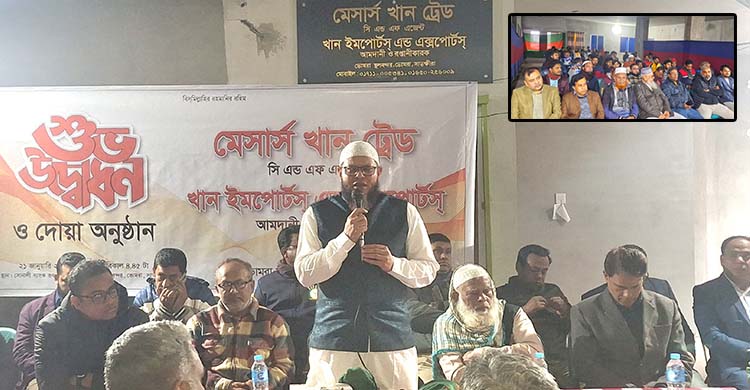 সাতক্ষীরায় নতুন আঙ্গিকে আমদানি-রফতানীকারক বাণিজ্যিক প্রতিষ্ঠান ‘খান ট্রেড এবং খান ইমপোর্টাস এন্ড এক্সপোর্ট’ অফিসের উদ্বোধন করা হয়েছে। রবিবার (২১ জানুয়ারি) বিকাল সাড়ে ৫টায় ভোমরা স্থল বন্দরের সোনালী ব্যাংক ভবনের দ্বিতীয় তলায় দোয়া অনুষ্ঠানের মাধ্যমে ‘খান ট্রেড এবং খান ইমপোর্টাস এন্ড এক্সপোর্ট’ অফিস উদ্বোধন করা হয়। প্রতিষ্ঠানটির ব্যবস্থাপনা পরিচালক শাফিন আরমান খানের উদ্যোগে নতুন এই ব্যবসা প্রতিষ্ঠানের উদ্বোধন অনুষ্ঠানে বক্তব্য রাখেন সাতক্ষীরা পৌরসভার ভারপ্রাপ্ত মেয়র কাজী ফিরোজ হাসান, সাতক্ষীরা চেম্বার অব কমার্স অ্যান্ড ইন্ডাস্ট্রির সভাপতি নাসিম ফারুক খান মিঠু, ভোমরা স্থলবন্দর কতৃপক্ষের উপপরিচালক রুহুল আমীন, ভোমরা স্থলবন্দর সিএন্ডএফ এজেন্ট এ্যাসোসিয়েশনের সভাপতি কাজী নওশাদ দেলওয়ার রাজু, সাধারণ সম্পাদক এএসএম মাকসুদ খান, সাবেক সাধারণ সম্পাদক মোস্তাফিজুর রহমান নাসিমসহ বিভিন্ন পর্যায়ের নেতৃবৃন্দ। এসময় বক্তারা বলেন, খান ইমপোর্টাস এন্ড এক্সপোর্টসের নতুনভাবে যাত্রার ফলে আগামী দিনে সাতক্ষীরার সাধারণ মানুষের ব্যাপক কর্মসংস্থানের সুযোগ সৃষ্টি হবে। তাই ব্যাবসায়ী সংশ্লিষ্ট সকলকে এই প্রতিষ্ঠানকে আন্তরিকতার সঙ্গে সহযোগিতা করার আহ্বান জানান বক্তারা। শেষে প্রতিষ্ঠানটির সফলতা কামনা করে দোয়া করা হয়। দোয়া ও মোনাজাত পরিচালনা করেন ভোমরা স্থলবন্দর জামে মসজিদের খতিব মো. আবু বক্কর সিদ্দীক।