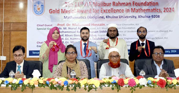 স্নাতক ও স্নাতকোত্তর পর্যায়ে গণিতে কৃতিত্বপূর্ণ ফলাফল অর্জনের জন্য খুলনা বিশ্ববিদ্যালয়ের গণিত ডিসিপ্লিনের চার শিক্ষার্থীকে ১১তম এ এফ মুজিবুর রহমান ফাউন্ডেশন গোল্ড মেডেল অ্যাওয়ার্ড প্রদান করা হয়েছে। আজ মঙ্গলবার সকাল ১০টায় ড. সত্যেন্দ্র নাথ বসু একাডেমিক ভবনে ইউআরপি ডিসিপ্লিনের লেকচার থিয়েটারে আয়োজিত এক অনুষ্ঠানে অ্যাওয়ার্ডপ্রাপ্তদের গোল্ড মেডেল পরিয়ে দেওয়া হয়। এ সময় তাদের হাতে সনদপত্র ও নগদ অর্থের চেক তুলে দেওয়া হয়।