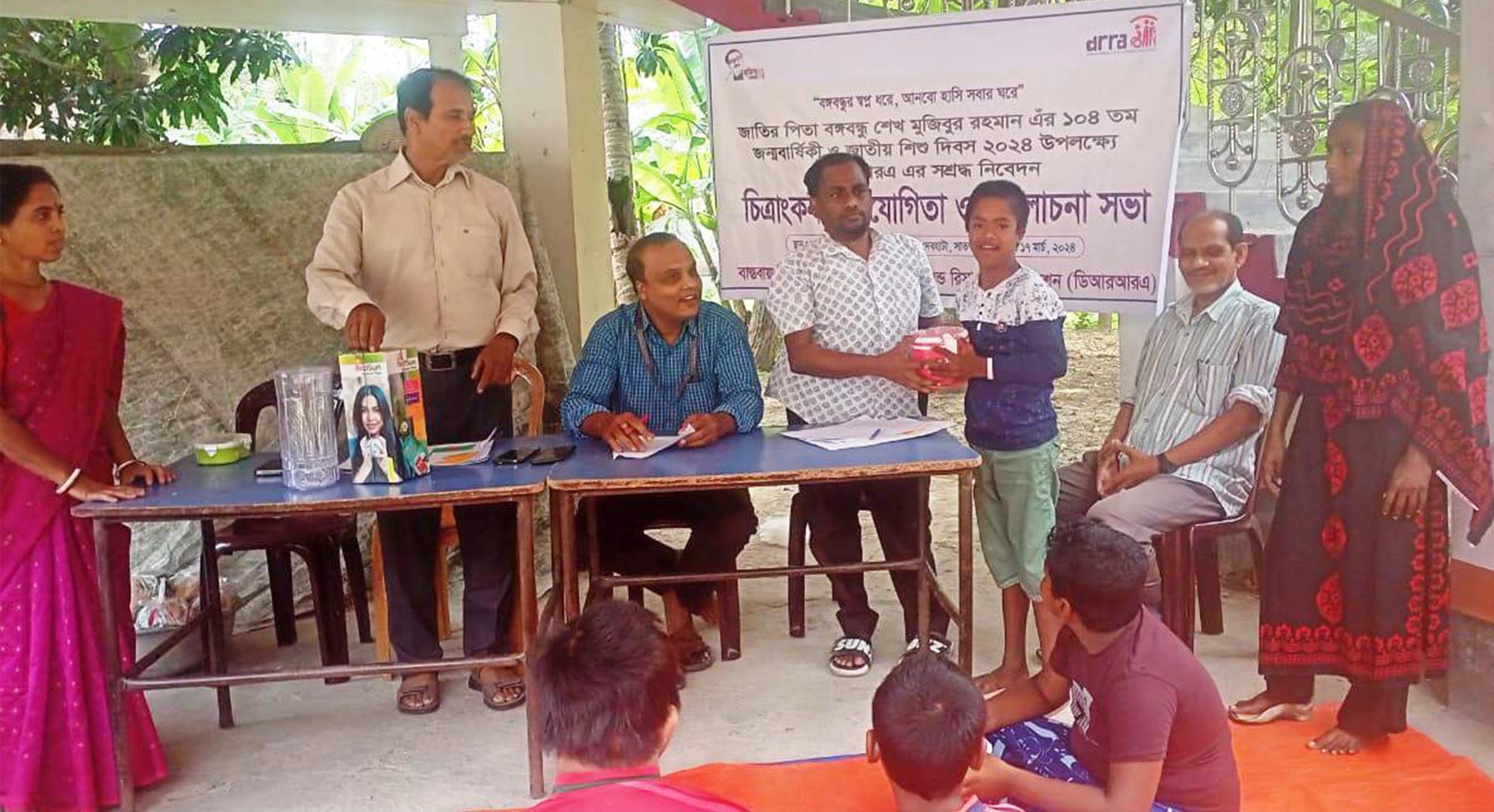 সমাজের পিছিয়ে পড়া জনগোষ্টি, বিশেষ করে ৩০ জন প্রতিবন্ধী ছাত্র ও ছাত্রীদের এবং তাদের অভিভাবকদের নিয়ে চিত্রাংকন প্রতিযোগিতা ও আলোচনা সভার আয়োজন করা হয়। এতে চিত্রাংকন প্রতিযোগিতায় জাতির পিতা বঙ্গবন্ধু শেখ মুজিবুর রহমান এঁর ছবিসহ আরও অন্যান্য ছবি এঁকে ১ম স্থান অধিকার করেন তানিয়া খাতুন। এছাড়া চিত্রাংকন প্রতিযোগিতা শেষে আলোচনা সভার আয়োজন করা হয়। এতে ডিআরআরএ’র আঞ্চলিক পরিচালক জিএম আনজির হোসেনের সভাপতিত্বে মূল আলোচনা উপস্থাপনা করেন ডেপুটি ম্যানেজার-ফাইন্যান্স এন্ড এডমিন তরুন কুমাস সরদার।